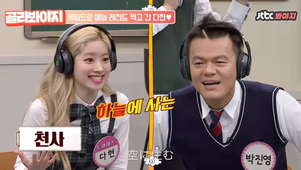 続いてダヒョンがリベンジです。「天使」というお題に挑戦しますが、「空に住む〜悪くない〜」と説明するダヒョン。いや、ちょっと説明下手ですよね。(笑)