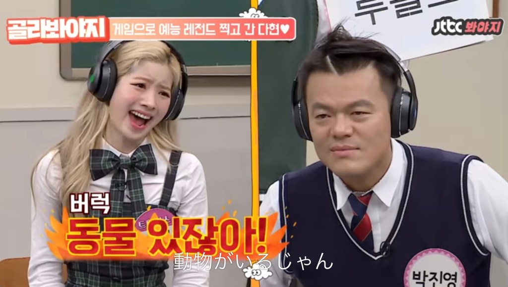 最初はパク・ジニョン氏とダヒョンが挑戦。ダヒョンがお題を説明して、パク・ジニョン氏が説明されたお題を当てるゲームですが、ダヒョンとパク・ジニョン氏の息が全く合いません!