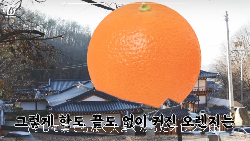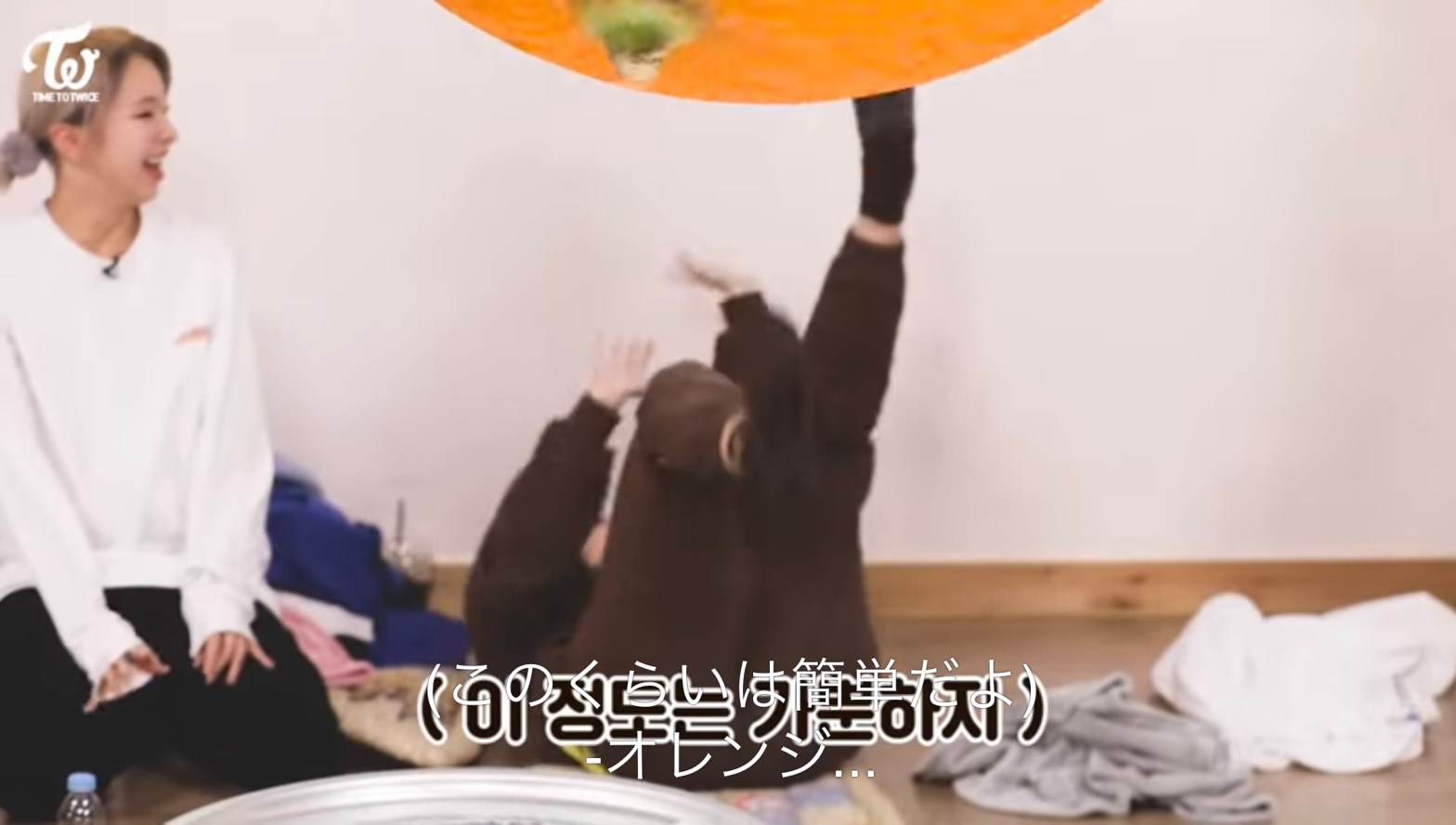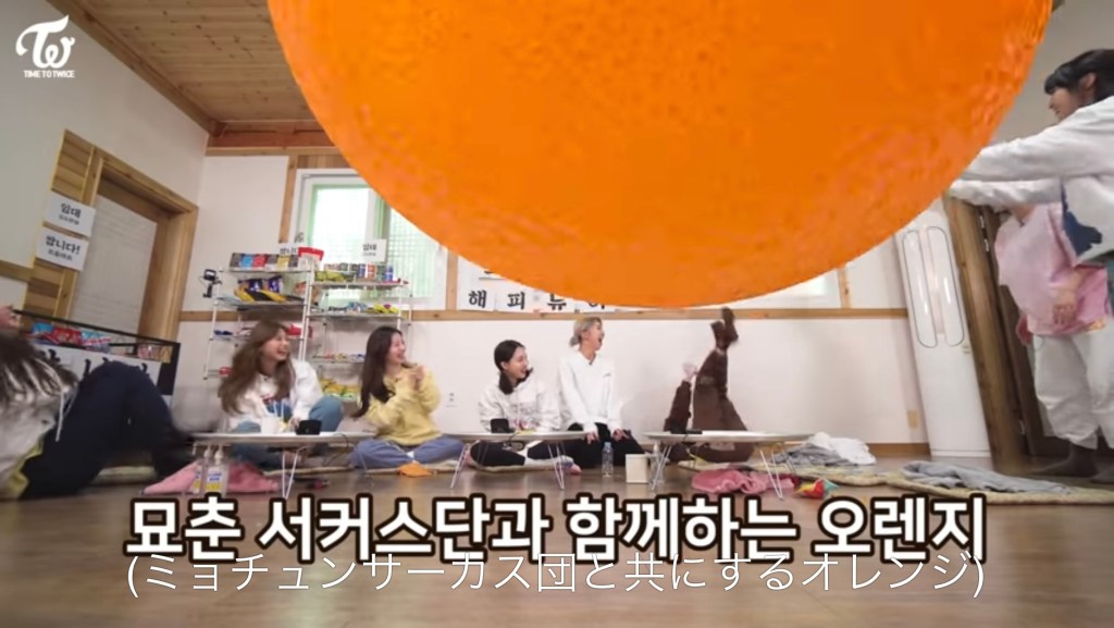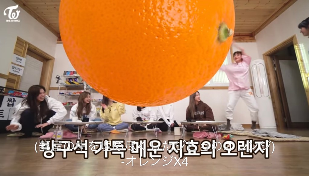 ジヒョからの特大オレンジをひっくり返って足で回すミナちゃん。(笑)こういうセンスもあるのがミナちゃんのすごいところですね!
