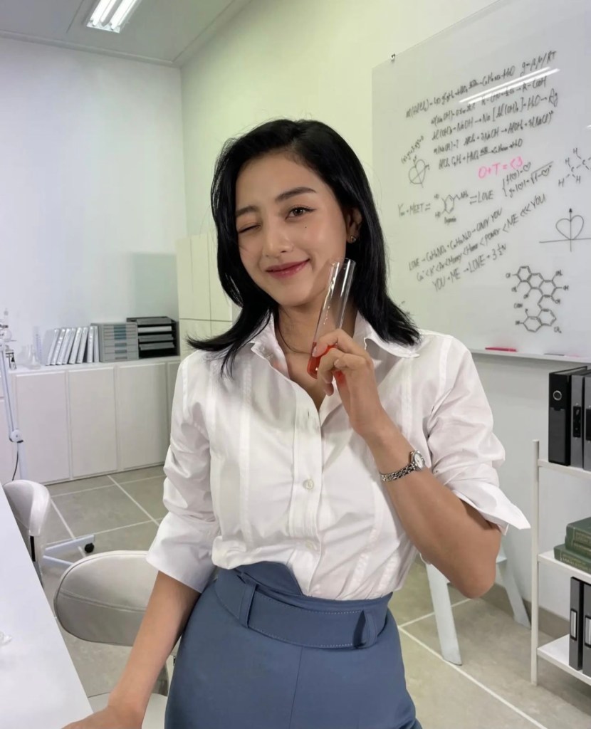 ジヒョちゃんは涼しそうなシャツ姿で登場。試験管を持ってウィンクをする姿はアジアンビューティそのものです。