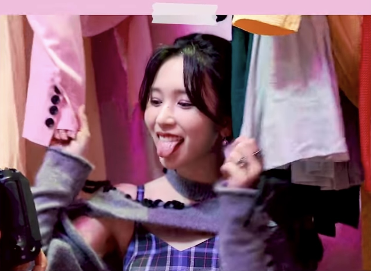 ミナちゃんがジヒョちゃんにカメラを向けられてツウィとぐるぐる回ってふざけ合うシーン。ミナちゃんのこういうところも愛される秘訣ですね!それにしても細いミナちゃんよりももっと細いツウィちゃん….